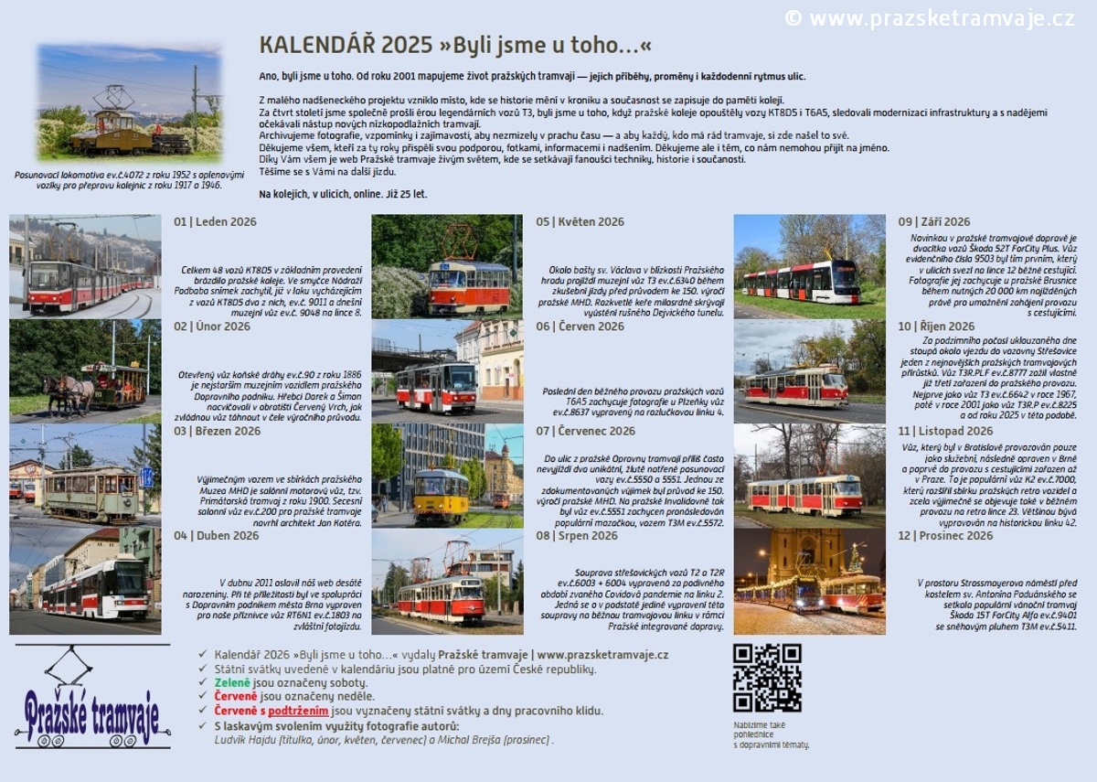 Zadní informační list nástěnného kalendáře Pražských tramvají 2026 »Byli jsme u toho...«